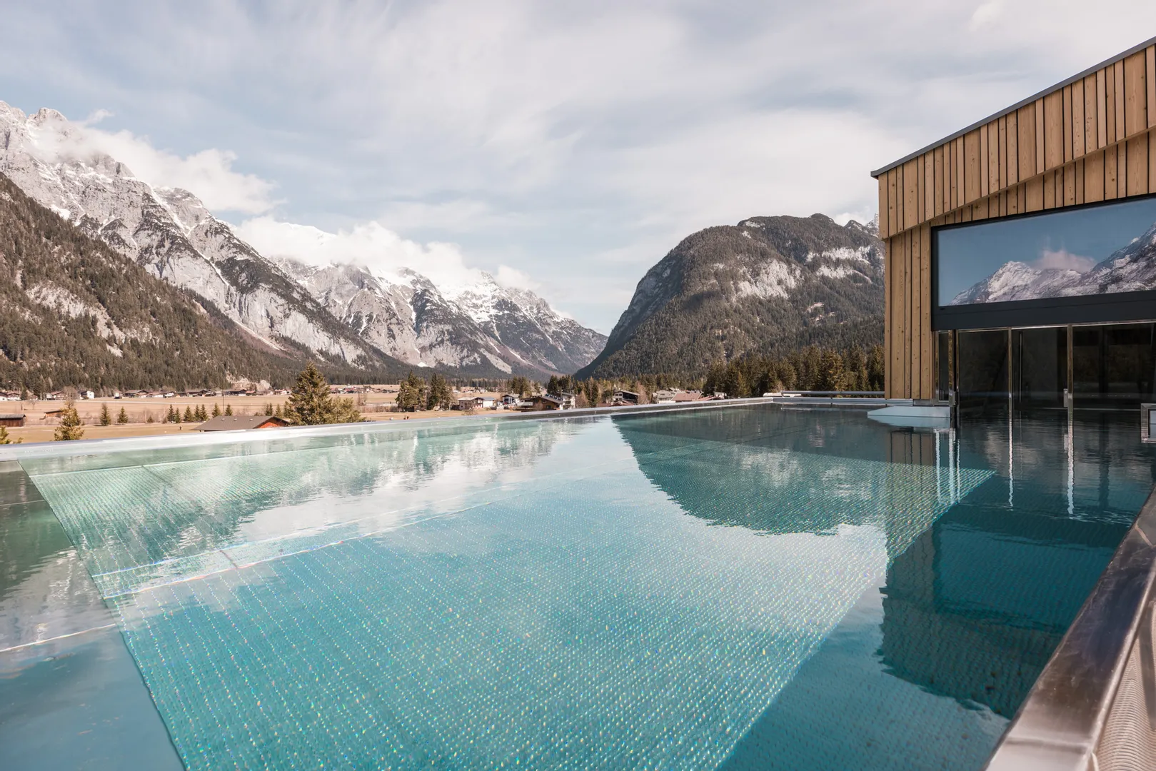 Schwimmen Sie dem Horizont entgegen – und lassen Sie dabei die Gedanken los. Richtung Westen begleitet Sie die mächtige Silhouette der Hohen Munde, nach Norden öffnet sich das Karwendel in seiner ganzen Größe, und östlich grüßt die markante Reither Spitze. Zu Ihren Füßen liegt das idyllische Leutaschtal, eingebettet zwischen Almen und Gipfeln. Ob Frühling, Sommer oder tief verschneiter Winter – der Moment im Wasser, zwischen Himmel und Bergkulisse, bleibt unvergesslich.
