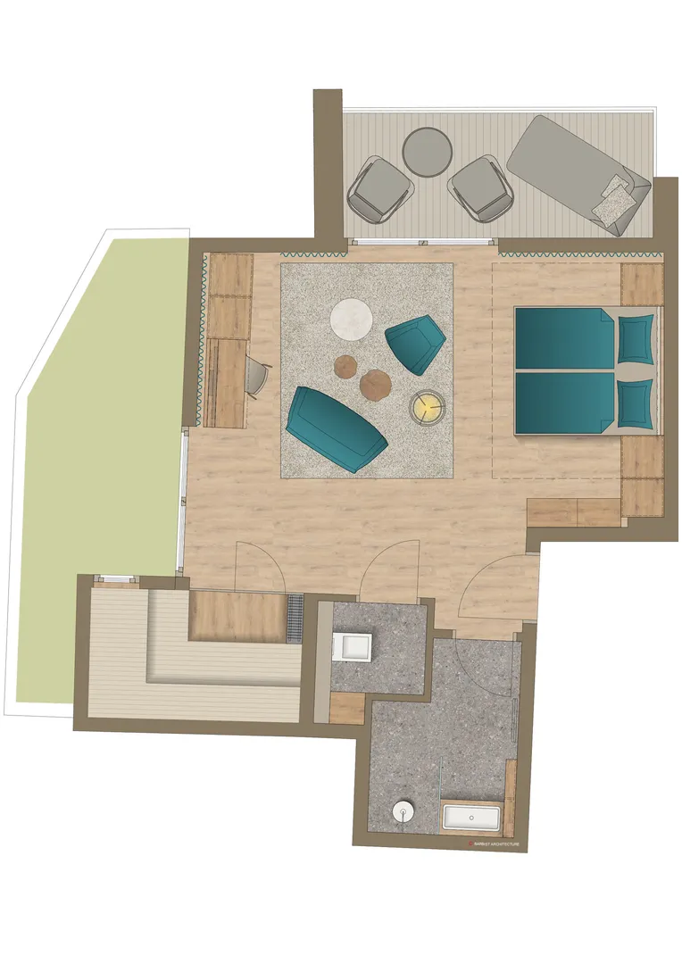 Two large panoramic windows. And a view that goes further than the moment. In the Junior suite Farbenspiel, you can experience the spectacle of the seasons up close - with an unobstructed view of the surrounding mountain ranges and the silence of nature. A spacious double bed, stylish design and cozy ambience create the perfect setting for days full of lightness - and nights full of depth. For all those who feel colors, seek space and prefer to have their favorite place at the top.