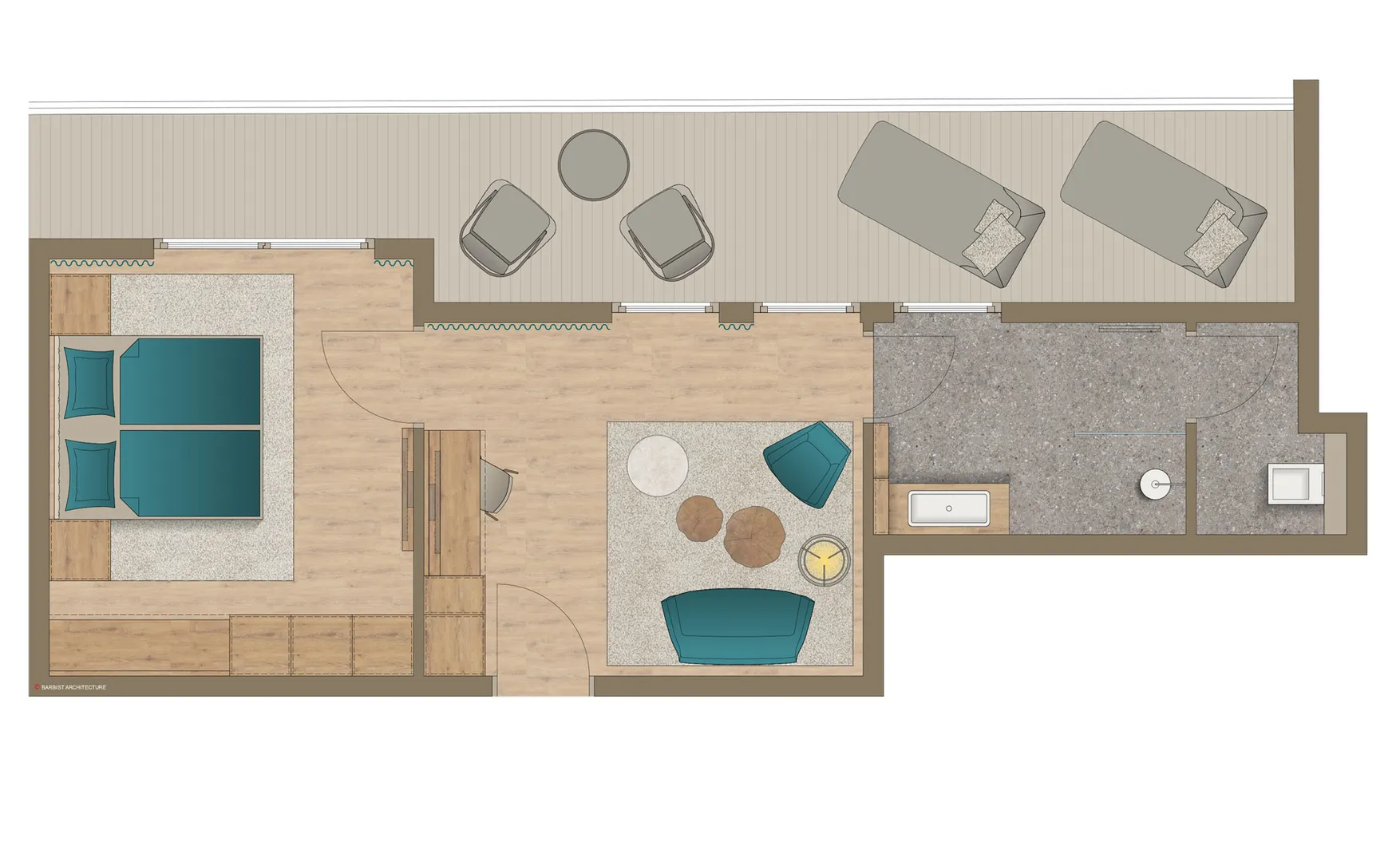 The Suite Rubin sparkles with far-reaching views: A panorama opens up across the valley to the Wetterstein and Karwendel mountains, allowing you to take a deep breath. Inside, stylish spaciousness awaits you - with separate living and sleeping areas, your own TV and a quiet balcony as your favorite outdoor spot. Natural wood shapes the character of the suite, adds warmth and creates an atmosphere of quiet elegance. For all those who love privacy - and are looking for something special. A retreat to arrive, stay and shine inside.